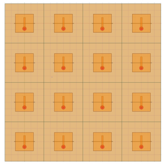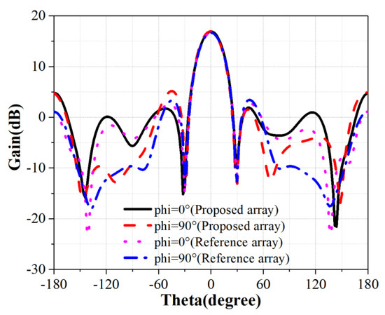 A conventional 4 × 4 patch array antennas consisting of the reference antenna is shown in Figure 19. The size of the reference array is 120 mm × 120 mm. The radiation far−field pattern simulation results of the array antennas are shown in Figure 20. The far−field patterns of the reference array and proposed array are basically the same and the gain difference is about 0.1 dB.