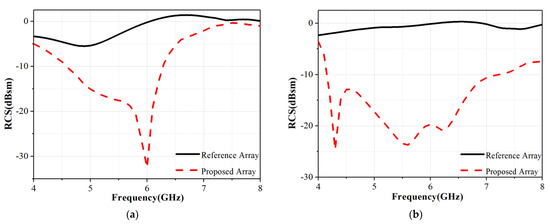 The simulation results comparison of the monostatic RCS between the two arrays is shown in Figure 21. For the x-polarized incident wave, the RCS of the proposed array is reduced from 4.0 GHz to 8.0 GHz compared with the reference array. The maximum value of RCSR is 32.3 dB at 6 GHz and the average value of in−band RCSR is 9.5 dB. The 6 dB RCSR bandwidth of the proposed array antenna is from 4.6 GHz to 6.6 GHz. Combined with the scattering characteristic mode analysis for the x-polarized incident wave, it can be concluded that the in-band RCSR of the x−polarized incident wave comes from the absorption and the out-of-band RCSR comes from CMC of the two antenna elements. For the y-polarized incident wave, the RCS of the proposed array is reduced from 4.0 GHz to 8.0 GHz compared with the reference array. The maximum reduction is 24 dB at 5.6 GHz, and the average RCSR value is 13.1 dB. The average value of in−band RCSR is 16 dB. The 6 dB RCSR bandwidth of the proposed antenna array is from 4.2 GHz to 8.0 GHz. Combining the scattering characteristic mode analysis for the x-polarized incident wave, it can be concluded that the RCSR of the y-polarized incident wave comes from CMC of the two antenna elements.