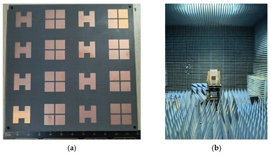 The scattering performance of the array antenna prototype is tested in the compact range anechoic chamber as shown in Figure 24. Array antenna elements are all matched 50 Ω loads, and the prototype is placed on a low RCS foam support. The plane wave of the test field is vertically incident on the antenna radiation surface, and the frequency sweep test is carried out. The measured and simulated monostatic RCS results of the proposed antenna for vertical incident plane waves with x−polarization and y−polarization are shown in Figure 25. The measured results are in good agreement with the simulated results. The difference between the measured results and simulated results is mainly due to assembly error and measurement error.