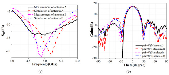 The S11 of the antenna prototype is measured by a vector network analyzer. Antenna elements are fed by coaxial probes. The measured and simulated S11 of antenna A and antenna B are shown in Figure 23a. The measured reflection coefficient less than −10 dB is from 4.54 GHz to 5.46 GHz, which is almost the same as the simulated results.