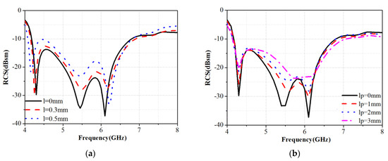 In order to illustrate the measured results, the impact of the manufacturing error is analyzed. The dielectric constant of the PCB printed board is more accurate. The pattern-etching machining technology is mature and the etching precision is higher. Therefore, the machining error introduced by the PCB can be ignored. The gap and the displacement between the double PCB layers play a major role in manufacturing error of the prototype. For the y−polarized incident wave, we calculated RCS in conditions of the space gap widths of 0 mm, 0.3 mm, and 0.5 mm respectively, as shown in Figure 26a. We also calculated RCS in conditions of the displacement sizes of 1 mm, 2 mm, and 3 mm respectively, as shown in Figure 26b. It can be found that the RCS simulation results with the error show the same trend of change as the measured results. Therefore, the gap and the displacement tolerances should be strictly controlled in the manufacturing process.