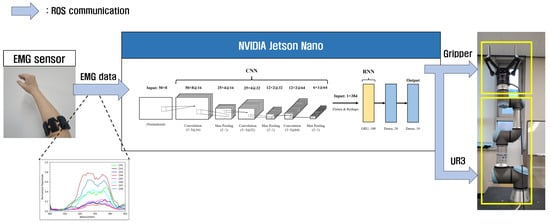 Proposed system configuration. EMG data are transmitted from the EMG sensor to the ROS environment on an NVIDIA Jetson Nano. The ROS-based embedded system controls a gripper and UR3 manipulator using the gesture classifier trained via deep learning.