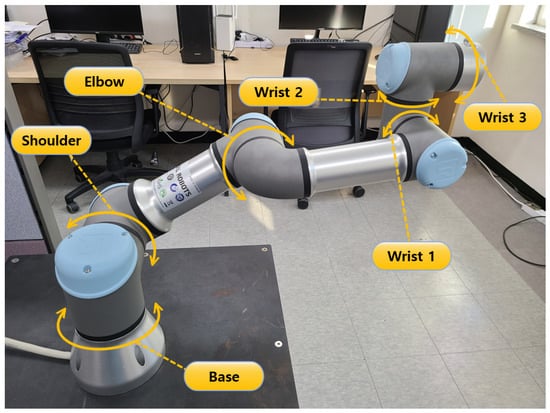 The industrial robot considered in this study is the smallest UR3 robot in the Universal Robot CB3 series. The UR3 robot arm is a cooperative robot arm with a collision detection function. The UR3 robot consists of a six-axis joint robot arm with joints labeled as “base”, “shoulder”, “elbow”, “wrist 1”, “wrist 2”, and “wrist 3”, as shown in Figure 2. As shown in Table 1, the maximum payload and maximum working radius are 3 kg and 500 mm, respectively. As shown in Table 2, the operating range of all joints is ±360°, excluding wrist 3, which can be rotated infinitely. The Universal Robot ROS Driver was installed to provide users with a stable interface between the UR robot and ROS.