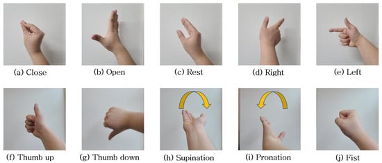 The proposed system uses EMG signal data based on hand gestures as inputs. Ten gestures that can intuitively express the movements of industrial robots, grippers, and user intentions were defined. The defined gestures are newly defined gestures, separate from the five classes of gestures recognized by the Myo armband by default. Additionally, as shown in Figure 5, the gestures were defined by considering the reflection of human intentions, differences in hand gestures, and ease of hand gestures. The defined hand gestures are “Close”, “Open”, and “Fist” for gripper control, “Right”, “Left”, “Thumb up”, “Thumb down”, and “Supination”, “Pronation”, for industrial robot arm control, and “Rest” as the default state for classifying hand gestures. All gestures are performed with the right hand. Start at “Rest”, perform a specific action, and then return to “Rest” for 1 s. For “Rest”, hold “Rest” for 1 s.