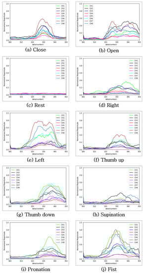 EMG data are microscopic electrical signals that can be obtained from muscle activity. EMG data are collected when wearing the Myo armband, as shown in Figure 6. One hand gesture operation (one set) was collected in the form of 400 EMG data from 50 samples of 8 channels over 1 s. The 400 EMG data were normalized using min-max normalization and then reshaped into a two-dimensional form with dimensions of 50 × 8 for deep learning model training. Figure 7 illustrates how the EMG data collected for each gesture were normalized and plotted. EMG measurements of different magnitudes corresponding to different hand gestures are the main characteristics of the data. Table 3 presents one set of EMG data. The data were collected from seven subjects (five males and two females) to create a universal classifier that can be used by both men and women. When collecting data for the ten hand gestures, each subject repeated each hand gesture 500 times. Of the 500 datasets collected, 400 and 100 were used as the training and validation data, respectively. Overall, 2800 training data were collected for each hand gesture, resulting in a total of 28,000 training data. We collected 700 validation data for each hand gesture, resulting in a total of 7000 data for validation.