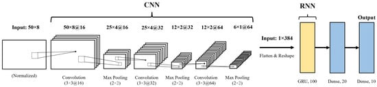 Studies on hand gesture recognition have been conducted using electromyography (EMG) signals, which are a type of biosignal. EMG signals are microscopic electrical signals that can be obtained from muscular activity and are widely used in various fields, including robotics and rehabilitation medicine. However, hand gesture patterns must be learned because obtained EMG signals are not always the same, even for the same motion. Based on the recent development of AI technology, it performs excellently on various recognition tasks. Popular models include the convolutional neural network (CNN) and recurrent neural network (RNN). Various studies have been conducted on learning EMG-based hand gestures using CNNs [,], RNNs [,], and convolutional recurrent neural networks (CRNNs) [,]. A CNN is an artificial neural network inspired by the concepts of the visual cortex of the brain. CNNs are mainly used for image deep learning and have achieved excellent performance. An RNN is another type of artificial neural network that excels at processing time series data. Unlike a CNN, an RNN recursively refers to previous states when calculating future states. Long short-term memory (LSTM) has been proposed to solve long-term dependency issues associated with forgetting previous information when the time step grows. Additionally, the gated recurrent unit (GRU) is a high-speed model with performance similar to that of LSTM that simplifies the cells of the time steps constituting LSTM networks. A CRNN is a high-performance classification neural network that combines the feature extraction capabilities of a CNN with the classification capabilities of an RNN for time-series data. In the structure of a CRNN, input data pass through multiple convolutional layers, activation functions, and pooling layers. The resulting flattened features are inputted into an RNN layer, and the class with the highest probability is the output.