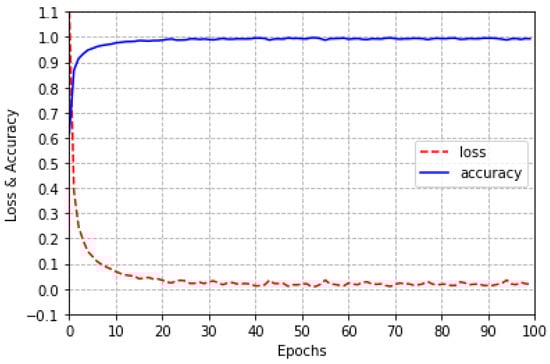 A CRNN is a high-performance classification neural network that combines the feature extraction capabilities of a CNN with the time series classification capabilities of an RNN. The proposed CRNN structure is presented in Figure 8. The input data are normalized EMG data. The convolutional layer consists of a 3 × 3 convolution filter. The pooling layer is a max-pooling layer with dimensions of 2 × 2. As the neural layers progress, the number of filters increases to 16, 32, and 64 to extract complex features. This structure is repeated three times to maintain the feature map size within a valid range. The extracted features are inputted into the fully connected layer. In the fully connected layer, a multidimensional array is flattened into a one-dimensional array and then inputted into the GRU layer. Finally, the data pass through a dense layer consisting of a rectified linear unit activation function and Softmax function, which output values for the 10 classes. Training was performed for 100 epochs, the learning parameters were set to 171 and 326, and the training data were shuffled. Figure 9 presents the training accuracy and loss according to the number of training epochs of the CRNN model. When the CRNN model is trained for 100 epochs, the accuracy increases and the loss decreases. Regarding the training results, the accuracy is 1.0 and the loss is 0.0247.