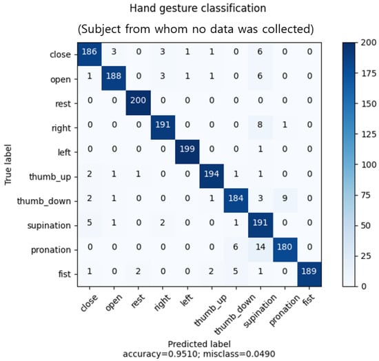 In the second experiment, the subjects from whom no training data were collected were tested. Each subject performed each gesture 50 times, and the four subjects performed a total of 2000 trials. The confusion matrix in Figure 11 presents the classification results for all the subjects in the second experiment. In the confusion matrix, each row and column represent predicted and true values, respectively. The individual confusion matrices of the subjects are presented in Figure A8, Figure A9, Figure A10 and Figure A11 in the Appendix A.