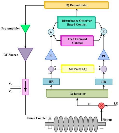 Superconducting radio frequency (SRF) cavities are widely used in particle accelerators due to their lower wall losses and higher accelerating gradients as compared to normal conducting cavities [1]. In many large accelerator projects such as the international linear collider [2], the next-generation light source (e.g., Linac Coherent Light Source (LCLSII) [3], European X-Ray Free-Electron Laser Facility (E-XFEL) [4] and Subcritical Hybrid Intense Neutron Emitter (SHINE) [5]), China Spallation Neutron Source (CSNS-II) [6], China initiative Accelerator Driven System (CiADS) [7], compact energy recovery linac (cERL) [8], and Chinese Accelerator Driven System Front-end (CAFe) [9] SRF cavities are used. The SRF cavity is a vital part of modern accelerators and the stability of the accelerating field inside the cavities is very important for the desired parameters of charged particle beams. For this purpose, field detectors are used to measure the accelerating field in radio frequency (RF) cavities and then suitable feedforward and feedback control techniques are applied. A generalized cavity field control architecture is shown in Figure 1. The pickup antenna on the cavity picks up an RF signal which is then down-converted to an intermediate frequency (IF) by mixing it with a local oscillator signal (LO). The resulting IF signal is then processed by an IQ detector to separate the I and Q components. These components are subsequently filtered using an infinite impulse response (IIR) filter, before being compared to values in a set point table. Any errors generated by this comparison are then fed to the controller, which in this case is a proportional integrator (PI) controller and a disturbance observer-based (DOB) controller. The outputs of these controllers are the I and Q components, which are converted back into an IF signal by the IQ-Demodulator, and are then up-converted to an RF signal. This RF signal is then sent to the preamplifier to drive the high-power RF source (such as a klystron). The output of the klystron, via the waveguide and directional coupler, powers the RF cavity through the input power coupler, completing the feedback loop. In RF particle accelerators, high power RF sources such as klystrons and magnetrons are used to power accelerating cavities. The high power oscillating electric field inside the cavity is responsible for the acceleration of the charged particle beam introduced in the cavity. Since the magnitude of the field is time-varying, the beam must be introduced in the cavity at a particular phase to obtain the desired energy or acceleration. If the magnitude and phase of the RF field are not stable, then the quality of the beam will suffer, as different bunches of the charged particle beam will receive different amounts of energy. The stable operation of a superconducting accelerator requires the identification and control of sources of perturbation in the RF field inside the cavity. Superconducting cavities are narrow bandwidth cavities and the main sources of field error in superconducting cavities are Lorentz force detuning [10] and beam loading [11]. In SRF cavities, disturbances can be classified into two categories—predictable and unpredictable. Lorentz force detuning and beam loading are predictable disturbances that are repeated in each RF pulse, while microphonics are unpredictable and are generally not synchronized with the RF system [11,12]. We used a standard cavity model and the parameters were chosen according to a disturbance observer for a superconducting accelerator, the compact energy recovery linac [13]. In this paper, a trapezoidal beam was simulated as the disturbance to the cavity accelerating field [13,14] and the beam loading effect was compensated by the disturbance observer and learning-based disturbance observer control.
