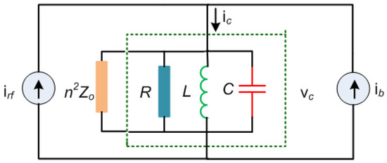 Superconducting cavities can be a single cell or multiple cells, depending upon the accelerator design and applications. We used a standard cavity model for the simulations, available in the literature [28,29,30]. The parallel RLC circuit cavity model coupled to an RF source via an input coupler is the basis for analyzing multicell cavities and their properties [28]. The RF source and the beam are modeled as current sources. The input coupler is modeled by a transformer and the transmission line characteristic impedance is denoted by . The equivalent circuit by transferring the RF source to the cavity side is shown in Figure 2, where, the RF cavity is represented by a parallel combination of Resistance ‘R’, Capacitance ‘C’, and inductance ‘L’. The phasor is the drive current by RF power source, represents the beam current. The phasor is the resulting cavity voltage and the phasor is the overall drive current given by