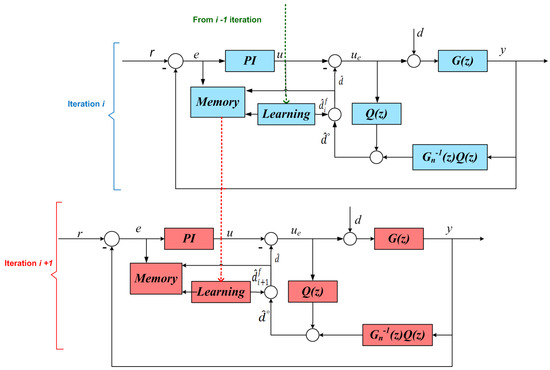 In the learning scheme, the recursive learning term computed from the previous iteration is added to the current iteration. The learning law for the iterative learning scheme is given as under