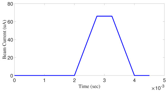 The cavity baseband model for -mode was simulated in MATLAB/Simulink with PI, DOB and learning-based DOB controllers. PI gains and were used [13]. For disturbance observer-based (DOB) control, we assumed the nominal plant model with the mismatch in cavity half bandwidth and a Hz offset in cavity detuning, 1 s loop delay and 50 Hz cavity half bandwidth. For better transient results, the PI and DOB gains were gradually increased during the rise time of the pulse. A trapezoidal beam pulse was introduced during the flat portion of the voltage pulse [14], having a 66 A peak current [13] as shown in Figure 7. A simplified rectangular beam pulse profile was used by Chengye et al. in a proposed modified iterative learning algorithm for cavity field control problem, to implement the algorithm inside a Field Programmable Gate Array (FPGA) [32].