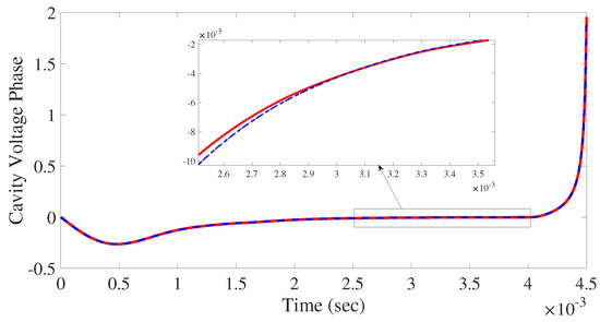 In Figure 8, the cavity voltage magnitude for DOB + PI and learning-based DOB + PI controllers are plotted. The reference tracking convergence time and steady-state tracking error are much better in the case of learning-based DOB as compared to DOB control. Due to faster convergence, flat top duration is increased and a wider beam pulse load can be managed. The cavity voltage phase is plotted in Figure 9, showing better tracking of the reference phase in the case of learning-based DOB + PI as compared to a conventional DOB + PI controller. The control inputs, highlighting the flat top or beam loading duration, for the case of LDOB + PI and DOB + PI control, are plotted in Figure 10; here, the value of the recursive coefficient “” was used for the simulation. In Table 3, a comparison of the performance of DOB and learning-based DOB is presented. The learning function was tuned to the value of for Hz cavity detuning; for other cavity detuning, it needs to be optimized, which is why, for at a detuning of Hz, learning-based DOB produces the best results and the variation in cavity voltage magnitude during the flat top is reduced to 33% of the voltage variation in the case of a conventional disturbance observer. The overall performance in the magnitude and phase stability of learning-based DOB + PI control is much better than with conventional DOB + PI control. From the results presented, it is evident that learning-based DOB provides a better magnitude and phase stability in the superconducting cavity field control problem as compared to conventional DOB.