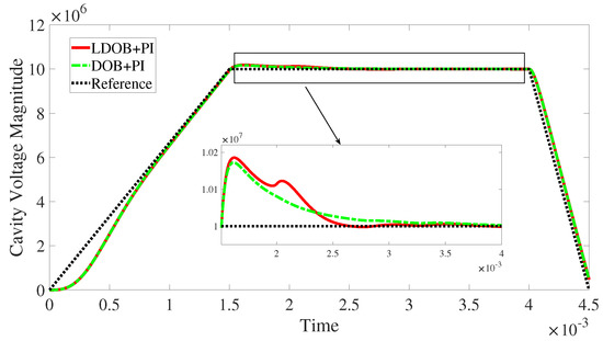 Cavity voltage magnitude for learning-based DOB + PI and conventional DOB + PI controllers, elaborating flat top voltage stability.