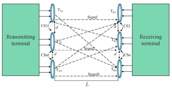 Magnetic induction communication offers several advantages in underwater environments. However, its low channel capacity poses a limitation. MIMO is employed to increase channel capacity and enhance signal transmission reliability. The use of multiple receiving and transmitting antennas enables the MI-MIMO system to mitigate the effects of crosstalk signals between coils and improve the efficiency of the underwater magnetic induction channel. Figure 2 shows the schematic diagram of the MI-MIMO system with an N × N antenna array. In this figure, TX1 and TXN represent the number of transmit antennas, while TR1 and TRN refer to the number of receive antennas. CS indicates the crosstalk signal between each coil. L denotes the transmission distance, and d represents the distance between coils. The strength of the crosstalk signal between coils is directly proportional to the distance between them. The dotted line between the coils represents the transmitted signal.