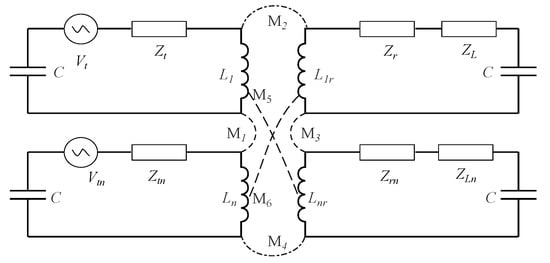 In Figure 3, the circuit elements , , , and represent the impedances of the transmitters and receivers, respectively. The load impedances of the receiver circuits are denoted by and , while C represents the capacitance of each circuit. The circuit voltage is represented by V, and Vtn means the voltage across the mutual inductance signals M1, M2, M3, M4, M5, and M6 between the coils. The interference between the coils on the same side can be eliminated by adjusting the coupling strength and coil spacing. L1, Ln, L1r, and Lnr denote the transmitting and receiving coils. When the MI-MIMO system has NT transmitting coils and NR receiving coils, the path loss can be expressed as (6) [,]: