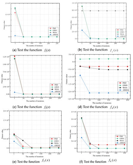 Figure 5 shows a visualization of the AWOA and its comparison with other algorithms. It shows that the AWOA reaches the optimal value after 50 iterations. In addition, AWOA achieves the smallest optimal value at the beginning of the first iteration compared with the other algorithms. Considering both the optimal value and the number of iterations, it is clear that the AWOA has a superior convergence speed and ability to find optimal solutions.