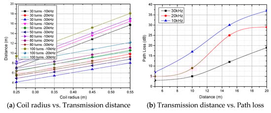 It should be noted that if the coil radius is too large and the number of turns too high, this can dramatically increase node deployment and development costs, which is unacceptable for underwater networks with many node deployments. Another point is that a too-large coil radius could make the node a specific target for submarine detection. This would defeat the purpose of magnetic induction, which is designed for secure and confidential communications. We also compared the signal path loss at different magnetic induction communication frequencies, as shown in Figure 1. The path loss increased as the communication distance increased. The lower the magnetic induction communication frequency, the higher the path loss. Magnetic induction communication with a relatively high frequency at the same distance resulted in lower communication losses.