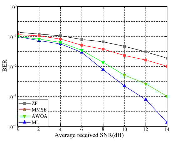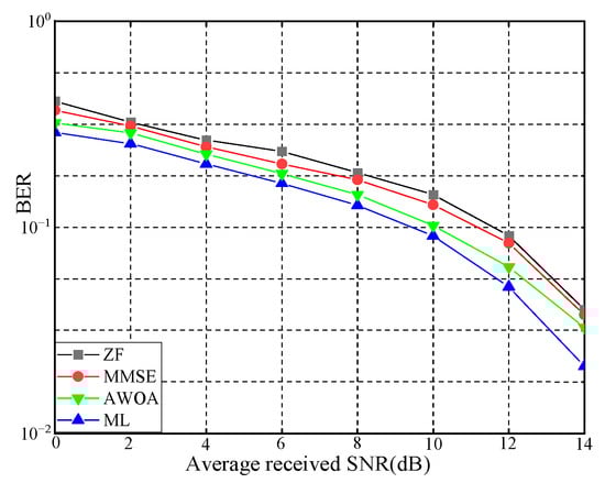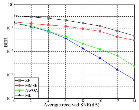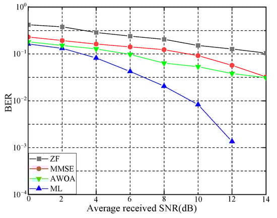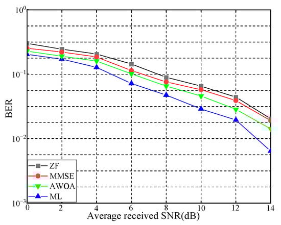 The BER is a crucial index for evaluating the performance of detection algorithms. Figure 7, Figure 8 and Figure 9 compare the BER of four algorithms under QPSK modulation with different numbers of antennas. When the number of antennas was two for both transmitters and receivers, the AWOA achieved a BER of dB. When the number of antennas increased to four, the AWOA’s BER was dB. When it was eight, the BER dropped to dB. As the average received signal-to-noise ratio increased, the BER gradually decreased. Although the increasing number of antennas leads to more interference signals, AWOA detection maintains certain advantages and exhibits noticeable BER performance, which can offer practical insights.
