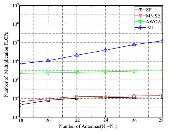 Figure 10, Figure 11 and Figure 12 illustrate the BER performance comparison of the four detection algorithms in the MI-MIMO system with 16-QAM modulation using different numbers of antennas. When two transmitters and four receivers were used, BER further decreased to dB. When there were four transmitters and si× receivers, the AWOA’s BER was dB. With eight receivers, the BER decreased to dB. These figures reveal that as the number of receiving antennas increased, the BER decreased following the diversity gain law. Therefore, the BER performance in MI-MIMO systems is closely related to the modulation scheme.