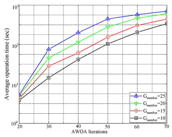 This paper presents the number of significant multiplication calculations for the four algorithms studied in Figure 13. It is evident that, for the same number of antennas, the complexity of the AWOA is lower than that of ML and higher than that of ZF and MMSE. Furthermore, we investigated the computation time of the AOWA for different iterations and population sizes, as shown in Figure 14. It is evident that the number of populations and iterations directly impact the complexity. Regarding complexity, ZF and MMS algorithms are the most computationally efficient. In contrast, the AWOA detection algorithm and ML algorithms use random selection and traversal concepts, leading to increased complexity.