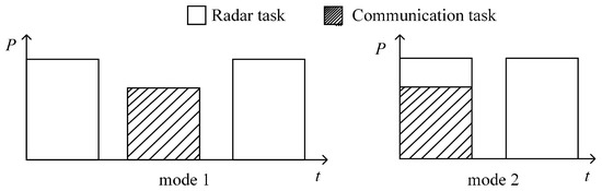 With the development of electronic technology, it is difficult for a single electronic hardware to account for the realistic demand in today’s complex multi-task scenario, which promotes the development of electronic systems, such as detection, communication and interference, to the multifunctional integration system (MFIS). MFIS can bring many advantages, such as system volume decrease, power consumption reduction, electromagnetic interference suppression, and the improvement of spectrum resource congestion, which have been widely studied [1,2,3,4,5,6,7]. As two widely available functions in MFIS, radar sensing and wireless communication have many similarities in the system structure and working mechanism, which makes the integration of them an inevitable development direction, and the research and application of joint radar–communications (JRC) waveform is very important. The versatility of MFIS makes it a multi-task system. How to allocate system resources reasonably and manage it adaptively in the complex multi-task scenario is of practical and important significance for improving system efficiency and exerting its full work potential.