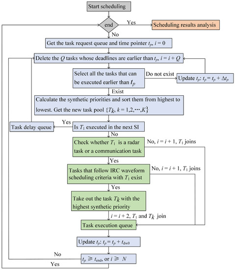 - Step 7: Test whether the task following the JRC waveform scheduling criterion with can be selected from the tasks other than . If so, turn to Step 8; otherwise, send to the task execution queue and update according to (12). Then, set .