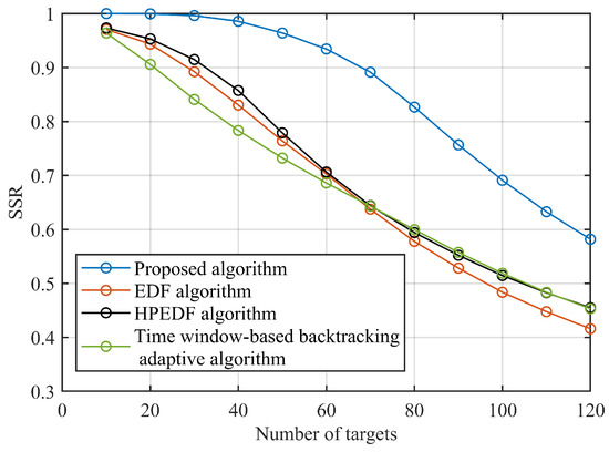 Figure 8 shows the comparison of the successful scheduling ratio of the four algorithms. It can be seen from the figure that the SSRs of the four algorithms decrease as the number of targets increases. Among them, the EDF algorithm, HPEDF algorithm and time window-based backtracking adaptive algorithm drop the task requests when the number of targets is 10, while the proposed algorithm starts to drop the task requests when the number of targets is over 20. Moreover, the SSR of the proposed algorithm is significantly higher than the other three algorithms, and reaches 89% when the target number is 70, while the other three algorithms only reach 64%. This is because some radar tasks and communication tasks can be combined in pairs, and then the paired two tasks are integrated into one based on the JRC waveform in the timeline, which greatly reduces time consumption and greatly increases the number of successfully scheduled tasks.