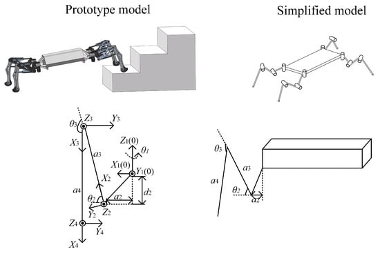 D-H coordinate system of the single-leg structure of the prototype and the simplified model.
