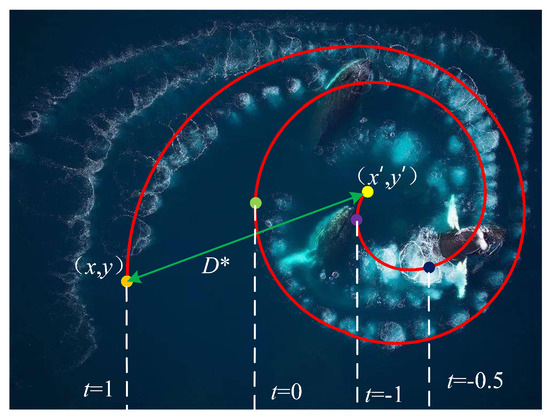 As shown in Figure 2, to simulate the spiral updating of position, it is necessary to first calculate the distance between each whale and the prey (,) and then simulate the way the whale moves by using a spiral mathematical model, which is modeled as follows: