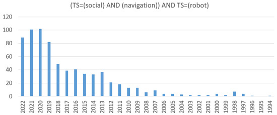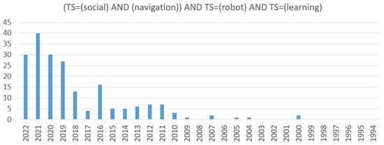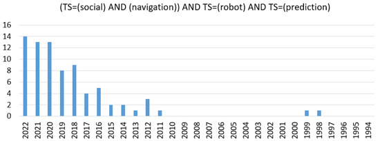To gain insight into the number of papers published on our focus topics, we can refer to the graphs in Figure 1, Figure 2 and Figure 3. These graphics were generated using data from the Web of Science (https://clarivate.com/webofsciencegroup/solutions/web-of-science/, accessed on 13 February 2023). For the topic (TS = (social AND navigation)) AND TS = (robot), we obtain 723 results in the range from 1994 to 2022 (data from the current year, 2023, were not included as the year has not finished and these data could disturb the statistics). Adding TS = (learning), the number of citations reduces to 207 results (Figure 3). With TS = (prediction), the number is reduced to 80 results (Figure 2). From this large dataset, we have covered in this survey 100 papers. Figure 4 compares the papers covered by the survey by Kruse et al. [13] and the current review.