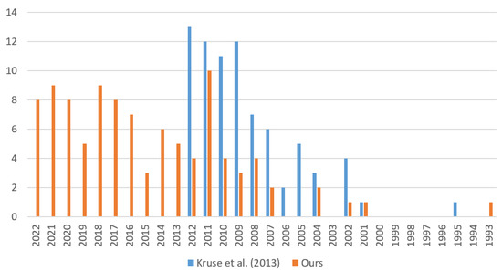 Distribution of publications over years considered by the review paper by Kruse et al. [13] and the current survey.