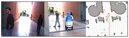 As mentioned above, the goal of socially aware navigation is not only to find a collision-free path from a starting point to a destination. This navigation process also requires carefully taking into account the movement of people around the robot, and the interactions processes between the robot and these people. When the number of people is small, few interactions are required to avoid possible collisions. People tend to move along rectilinear trajectories over long periods of time. However, when the density of people increases, problems arise [14]. In these scenarios, people have to frequently change their motion states (direction of travel, but also velocity or acceleration) in real time, to avoid collisions while trying to reach their destinations. Linear models are no longer correct for modeling interactions (human–robot, but also human–human). The perception of the robot’s movement by others becomes particularly relevant. Thus, in addition to being safe, it is important that the motion of the robot is legible, allowing people in the vicinity of the robot to easily understand its movement intention [15].