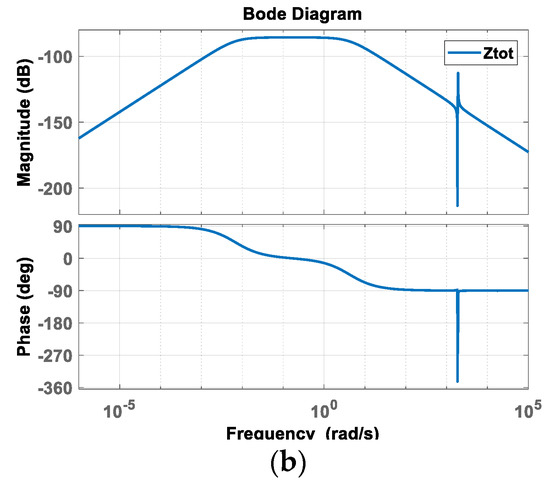 Then, an impedance analysis has been conducted in the MATLAB Simulink platform for the given system. Figure 3a presents the output and input impedances, whereas Figure 3b presents the total impedance seen from the DC link. From Figure 3a, it is evident that the output impedance is far away from the input impedance except for three resonance peaks, which are 230 Hz, 2280 Hz, and 2790 Hz, respectively. Figure 3b presents the total input impedance seen from the DC link, whereas only 230 Hz of the potential oscillatory mode is observed.