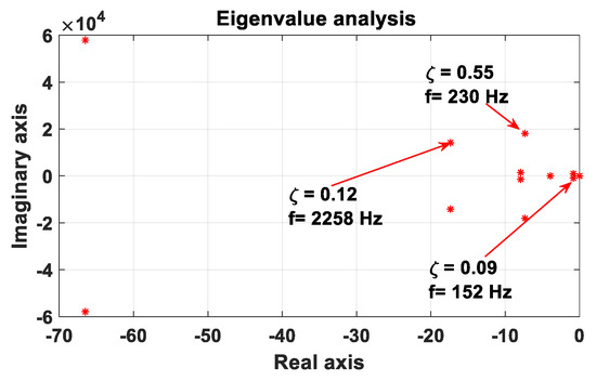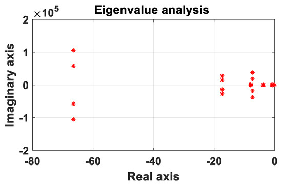 From the impedance analysis, three sensitive modes have been identified, and they are 230 Hz, 2280 Hz, and 2790 Hz. However, the source of the problem and the critical mode that contributes to oscillation could not be identified via impedance scanning. For this reason, the eigenvalue and participation factor analyses are recommended. To find out the sensitivity of the modes, an eigenvalue analysis has been conducted in the following subsection.