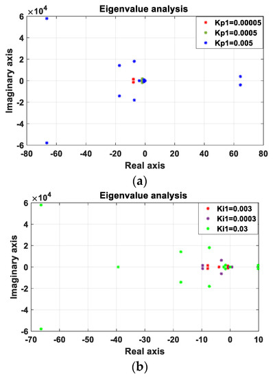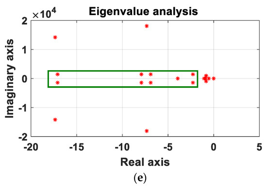 Furthermore, as a result of the arbitrary selection of the control parameters, ( = 0.0012; = 0.0044; = 0.0079), an interesting scenario can be observed, which is depicted in Figure 6e. Changes in the controller gain notably influenced the eigenvalues movements. It is also noted that the imaginary parts of modes 1, 2, 4, and 5 become equal when the converters’ integral gains are tuned at 0.0012 pu, 0.0044 pu, and 0.0079 pu, respectively. A 230-Hz oscillation frequency has been observed during the interaction point, as marked by a rectangular box plot. Hence, the interaction between these modes occurs in the system. The interaction event might lead to the system developing into an unstable situation. This is an indication of resonance, which can lead to the deterioration of the system stability. As can be observed, with the change in the PI controller parameters, the overall system becomes very sensitive, and the system becomes unstable as the eigenvalues move to the right-half plane.