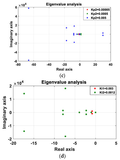 This case study investigates the sensitivity of the individual and multiple units of buck converter gains on the stability of the overall DC microgrid. A small variation in the PI gain has been considered for this case study. Figure 6a–c present the root loci due to the variation in the proportional and integral gain separately and concurrently. Under the variation in the proportional and integral gains of the buck converter, the eigenvalues are found in the stable region. However, the incremental value of the proportional gain of multiple units of converters considerably influenced the movements of the eigenvalues, as given in Figure 6d. The imaginary parts of modes 1 and 3 become equal when the proportional gain of the buck converter is tuned at 0.0044 pu. An oscillation at a frequency of 230 Hz has been observed around the interaction point, as marked by the rectangular box. Hence, the interaction between these modes potentially occurs in the system.