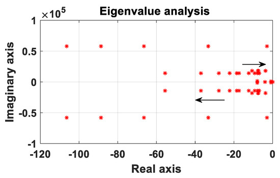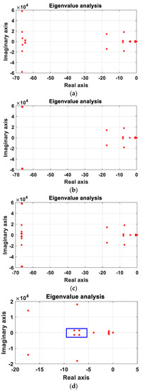 The fourth case study presents the stability of the overall system with respect to load changes. The ZIP load has been considered for the analysis. The assessment results are given in Figure 8. The load is varied with 5-kW steps. From Figure 8, it is observed that the eigenvalues gradually move to the left half-plane with the gradual decrease in the load. On the other hand, the eigenvalues slowly move adjacent to the imaginary axis with the increase in the load, but still stay within the complex of the left half-plane. Therefore, the system remains stable. Table 6 shows the load compositions and their impact on the overall stability margin. Based on the results discussed in this section, it can be concluded that changing the load compositions and parameters has little impact on the system stability.