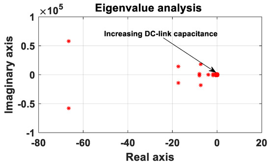 The DC-link capacitor is a crucial part in connecting the PV/BESS systems as it acts as an electrostatic energy-storing device to release the energy at the time of the disturbances. The third case study is dedicated to investigating the sensitivity of the systems with respect to the variation in the DC-link capacitance. Figure 7 presents the stability margin of the system with respect to changes in the DC-link capacitance between 400 µF to 2700 µF. As can be seen, the eigenvalue with the 153-Hz mode slowly moves to the adjacent imaginary axis with the DC-link capacitance. The eigenvalue of the system moves to the right-hand side, and the system becomes unstable after 2400 µF. This study shows that in a converter-connected power system, an appropriate calculation of the DC-link capacitance by considering the stability analysis is very crucial. This investigation clearly shows the significance of the stability analysis before adding the converters and capacitor bank. Hence, it has been strongly proposed for its utility in industry to conduct a comprehensive stability analysis before adding any capacitor bank and power electronic devices into renewable energy-integrated DCMGs.