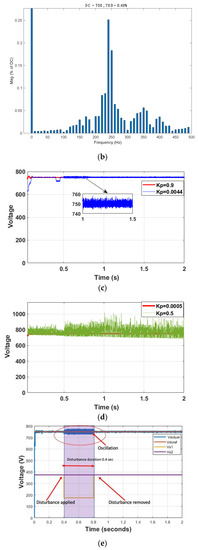 The effect of the controller dynamics on a DC microgrid is visualized in a time-domain simulation, as given in Figure 10a–d. These results corroborated the previous steady-state analysis obtained using the eigenvalue analysis, as given in Figure 5 and Figure 6. Figure 10a presents the impact of the integral controller dynamics on the DC bus of the DCMG. It is observed that at an appropriate gain setting and an oscillation-free and stable DC bus voltage can be obtained, since, in this gain setting, the two sensitive modes and their oscillation frequency were far away from the imaginary axis. Hence, an oscillation-free DC bus voltage is observed. When the integral control gain is tuned at 0.5 pu, a continuous voltage oscillation has been found in the DC bus. At this gain setting, the eigenvalue moves towards the right half-plane. Therefore, the significant deterioration of the DC bus voltage is observed. Furthermore, an FFT analysis is conducted on the DC bus. A 240-Hz oscillation has been observed, as shown in Figure 10b. Likewise, a very similar scenario has been observed when the parameters of the buck converters are changed, as depicted in Figure 10c. In contrast, a different scenario has been observed when the proportional gain of the boost converter is tuned to 0.5 pu. In this setting, a continuous voltage oscillation is observed from the beginning of the simulation period, as presented in Figure 10d. Furthermore, to see the worst-case scenario, simultaneous disturbances have been applied both on the source side and load side. The recorded results are depicted in Figure 10e,f. Results show that with respect to the disturbances, a large overshoot along with a power oscillation is observed in the DC bus.