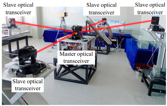 In the experiment, the four slave optical transceivers were in different rectilinear motion states and scanned the beacon beam of the master optical transceiver. The master optical transceiver has four reflectors that stare at the approximate positions of the slave transceivers, waiting for the beacon beams from the slave optical transceivers. Once the beacon beams from the slave optical transceivers were captured, the master transceiver sent a confirmation beacon beam to the slave optical transceivers and adjusted the four reflectors to ensure the simultaneous communication of the four laser paths. Accordingly, the simultaneous siting, capture, and tracking of the four points were realized in this experiment. The actual master optical transceiver and slave optical transceivers are depicted in Figure 3.