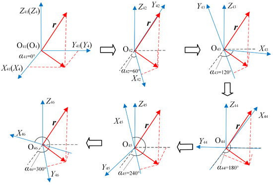 According to the positioning characteristics of the six reflectors’ coordinate axes, the six reflectors’ coordinate systems O4iX4iY4iZ4i (i = 1,2,…,6) were established on two parallel planes, one for each of the three coordinate systems. The coordinate system O4X4Y4Z4 rotated for 0°, 60°, 120°, 180°, 240°, and 300°, respectively, around the Z4 axis, thereby transforming into six coordinate systems, namely, O41X41Y41Z41, O42X42Y42Z42, O43X43Y43Z43, O44X44Y44Z44, O45X45Y45Z45, and O46X46Y46Z46. The transformed coordinate systems of each reflector are illustrated in Figure 5.