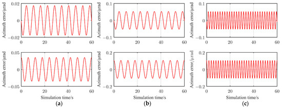 As revealed, Figure 7, Figure 9, Figure 11, Figure 13, Figure 15 and Figure 17 show the LOS attitude curves of six reflectors under the condition of conical motion in an ideal state. As the cone angle a and the angular speed ω increase, the motion environment becomes increasingly harsh. The azimuth and pitch curves are constant in amplitude and periodic. Although the amplitude of the curve is not large, great fluctuations appear at the peak and valley. When conducting numerical resolution for the attitude of LOS, because the RK4 method is an equal step method, it is difficult to realize numerical approximation in detail near the peak and valley. This method uses the angular speed of the gyro, so a certain compensation can be done at the peak and valley. Figure 8, Figure 10, Figure 12, Figure 14, Figure 16 and Figure 18 show the resolution error curves of LOS attitude corresponding to the reflectors. We can see from the curves that the resolution errors at the peak and valley are large and the error curves show periodicity. Although the indirect method shows high precision in terms of resolution, error accumulations of different levels occur in the coordinate systems of the six reflectors, which do not result in too large deviations in the error curve. The numerical calculation error curves obtained using the indirect calculation method for the six reflector coordinate systems were different. The calculation errors increased with the increments in the simulation duration, cone angle a, and angular velocity ω. The determined numerical calculation error values are listed in Table 1.
