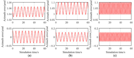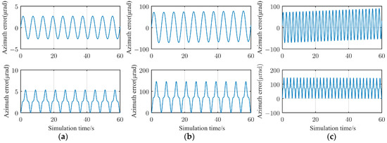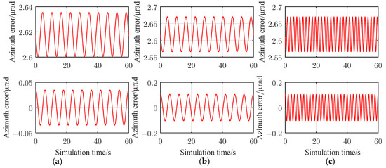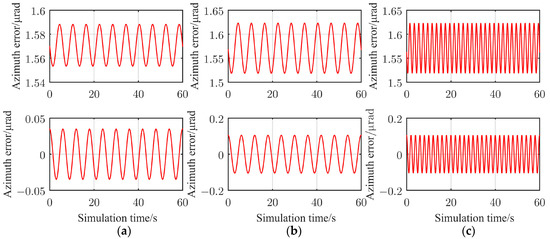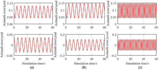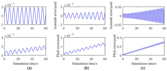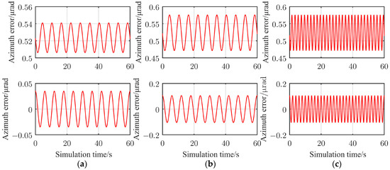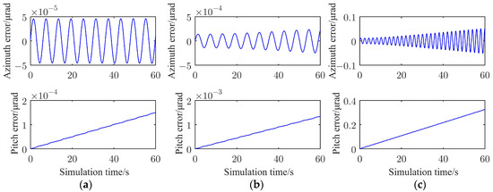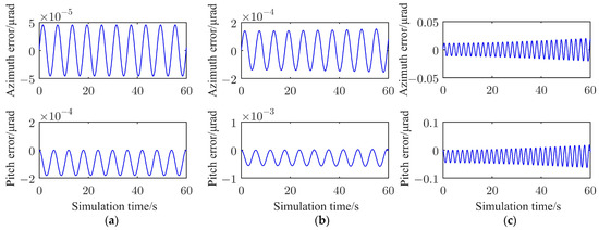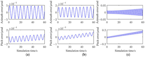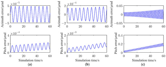 As can be seen in Table 1, the numerical calculation errors of the attitudes of the LOS of the reflectors were similar in the six reflector coordinate systems. The comprehensive calculation precision in the azimuth and pitch of the attitudes of the LOS of the six reflectors for the conical motion (a) was above 10–3 µrad, for the conical motion (b) was over 10–2 µrad, and for the conical motion (c) was higher than 0.2 µrad.