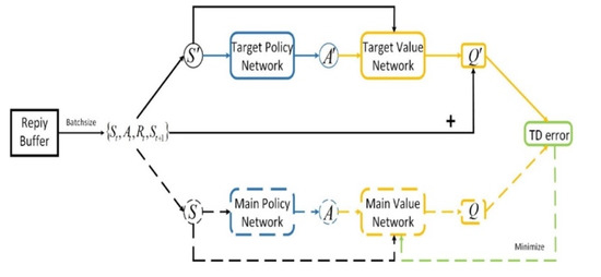 Obviously, the state and action space of the scene are continuous, which makes table-based value function methods such as Q-learning or DQN not applicable. We want to build a mapper from a continuous state to a continuous action as a strategy learning model. We therefore address this MDP problem using the deep deterministic policy gradient (DDPG) approach. DDPG is an actor–critic framework-based, policy-based algorithm. To decrease the correlation between subsequent samples and improve learning stability, experience replay and target networks are also utilized in combination with DDPG. The input consists of the main value network (), the main policy network (), the target value network (), and the target policy network (), which are initialized using the parameters , , , and respectively. We also set an appropriate value for the discount factor (), soft renewal coefficient (), the sample size of batch gradient descent (), target network parameter update frequency (), and the maximum number of iterations (). The whole algorithm is divided into two periods: the first, in which experience is accumulated, and the second, in which model training is completed. In the first phase, training data are generated using a policy network with random initialization of parameters. Each tuple is stored in the replay buffer. Once sufficient sample data are available, the model training phase begins. During each iteration, a minibatch is randomly drawn from the sampled data; then, the main strategy and value network are trained alternately. In this paper, we use to denote the feature vector of S. For the main value network, network optimization is based on minimizing the gradient of the mean square error.