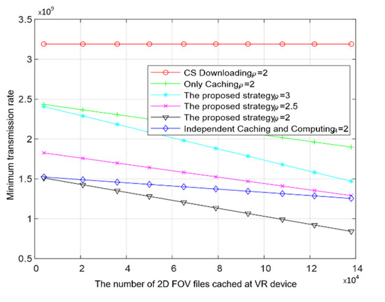 The impact of on the mean of the minimal necessary transmission rate (R) for various values and a comparison with alternative methods for are depicted in Figure 3. In the context of limited caching capability, the local hit rate is proportional to , which causes a decrease in the likelihood of retrieving the necessary FOV files from CS and, ultimately, minimizes . Nevertheless, the size of the 3D FOV file cached on the MEC servers and VR devices in the routes of 3CL and 3CM or sent via the 3CM and 2CCM routes grows with , controlling the number of FOV files and ultimately increasing . Then, does not change with due to the use of the CS download scheme with low caching capacity. The reasons for the trend in the cache-only and computation schemes are the same as in the proposed strategy. Furthermore, the proposed strategy has a significantly superior . This suggests that the cooperation of caching and computing resources between the device and the MEC server can provide benefits to the remaining communication. When the value of is small, R in the proposed strategy is similar to the independent caching and computing scenario because there are few locally cached FOV files, so the difference in gain is not significant.