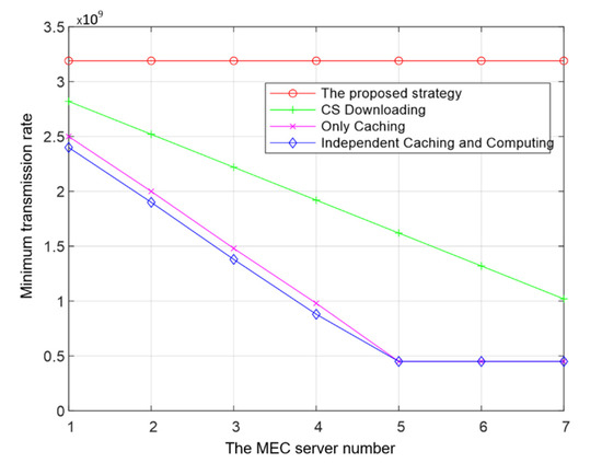 A comparison of the influence of on in the suggested strategy with other strategies is shown in Figure 4. The value of can be viewed as the cache capacity of all MEC servers because of the NFV process. When is in the range of 1 to 5, the cache hit probability of the MEC server increases with an increase in , and the value of decreases. When > 5, all data are cached on the server, so does not change with . The amount of data cached in the proposed strategy and the independent caching and computing scheme is less than the amount of data stored in the separate cache scheme. Therefore, in the range of 1 ≤ K ≤ 7, decreases as increases. Furthermore, when the MEC caching capability varies, the gain from the 2CL-FM and 3CM routes is nearly identical to that of the 2CCM route, making the two curves match to the suggested method and the independent caching and computing scheme.