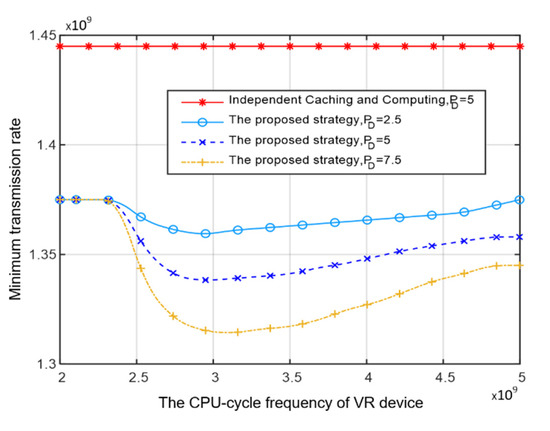 If , the VR device locally captures the 2D FOV of the relevant perspective before converting it to a 3D FOV using the onboard processor. The necessary minimum transmission rate is , and the service duration is (second). Because the processing power of the VR device increases considerably, it is predicted that or, in VR devices, the projection process is computed and can be completed within the service time restriction.