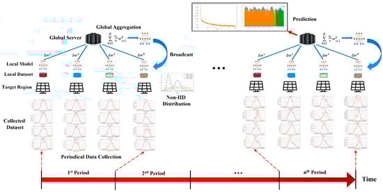 Non-deterministic attribute—Obfuscates the future strategy: The FL with an objective function being classification has been widely studied concerning convergence analyses [] and applications [,] since it assumes that the existing label types are predefined, which makes comparatively a straightforward setting. However, regression is a relatively arduous task compared to classification since the expected output vector is mostly continuous within the time domain, which must be accompanied by an assumption that the local datasets share similar distribution-wise statistical features to extract information. Such stochastic attribute increases the efforts of fine-tuning the single global model in FL to build a successful management system and hinders the stable convergence of the iteratively aggregated global model.