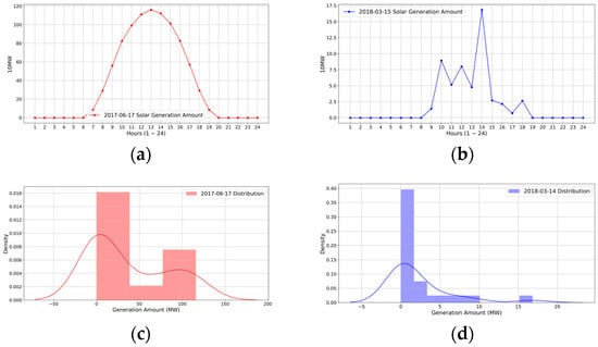Visualization sample (a,b) of daily solar energy generation and its distribution (c,d).
